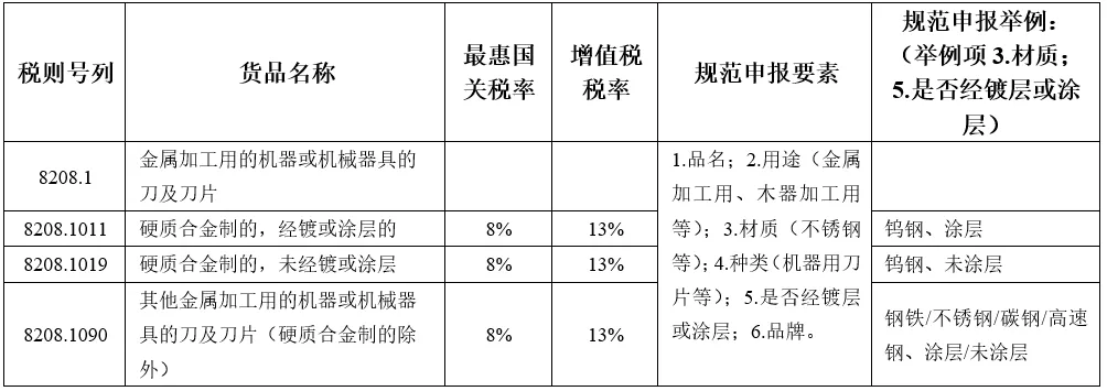 硬质合金是由金属碳化物与金属烧结而成的一种合金材料,以高硬度难熔金属的碳化钨等微米级粉末为主要成分,以钴、镍或钼为粘结剂,在真空炉或氢气还原炉中烧结形成粉末冶金制品,根据材质分类常见的有:钨钴类硬质合金(YG)、钨钛钴类硬质合金(YT)、钨钽钴类硬质合金(YA)、钨钛钽钴类硬质合金(YW)。用于金属加工的、机器或机械器具用硬质合金刀具归入六位税号8208.10,带有涂层或经镀的归入税号8208.1011,其他的归入税号8208.1019。