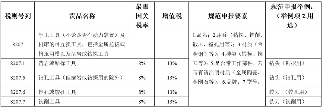 品目8207包括手工工具及机床的可互换工具,必须装于特定货品上搭配使用,按照用途和是否带工作部件划分具体商品编码。其中,凿岩或钻探工具,包括采矿、油井钻探或探测用工具;钻孔工具,但凿岩工具除外。请按照商品申报用途并结合工作部件情况归入相应税号。