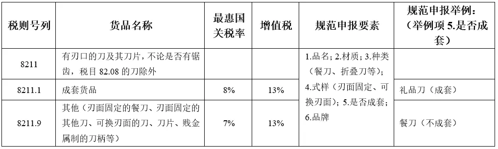 案例说明:归类错误,应归入税号8211.1000。申报规格中显示为成套刀具,应按照税则明归入成套货品。