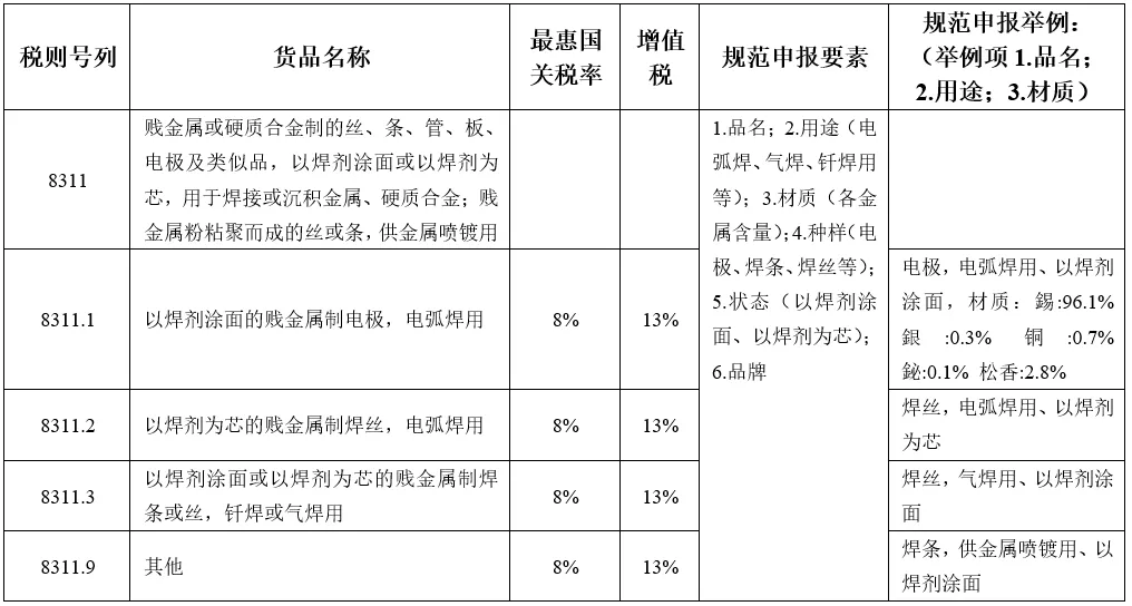 品目8311包括用于金属或硬质合金焊接或沉积的贱金属或硬质合金制的丝、条、管、板、电极及类似产品,这些产品以焊剂涂面或以焊剂为芯,按照用途(电弧焊或钎焊气焊)、状态(焊剂涂面或以焊剂为芯)进行具体子目划分。